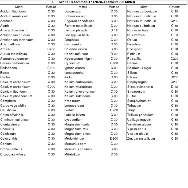 Die große Hebammen-Taschen Apotheke ist mit 90 homöopathischen Einzelmitteln (à 2 g) nach Dr. Friedrich P. Graf bestückt und ist ausgerichtet auf praktizierende Hebammen. Sie bietet mit weiteren 30 leeren Glasröhrchen Platz für eigene Einzelmittel. Homöopathische Arzneimittel, daher ohne Angabe einer therapeutischen Indikation. Alle Mittel handpotenziert. Die Zusammenstellung der Taschen-Apotheke ist mit einem Klick auf das rechte Kleinbild ersichtlich oder unter 0800-7464287 zu erfragen.